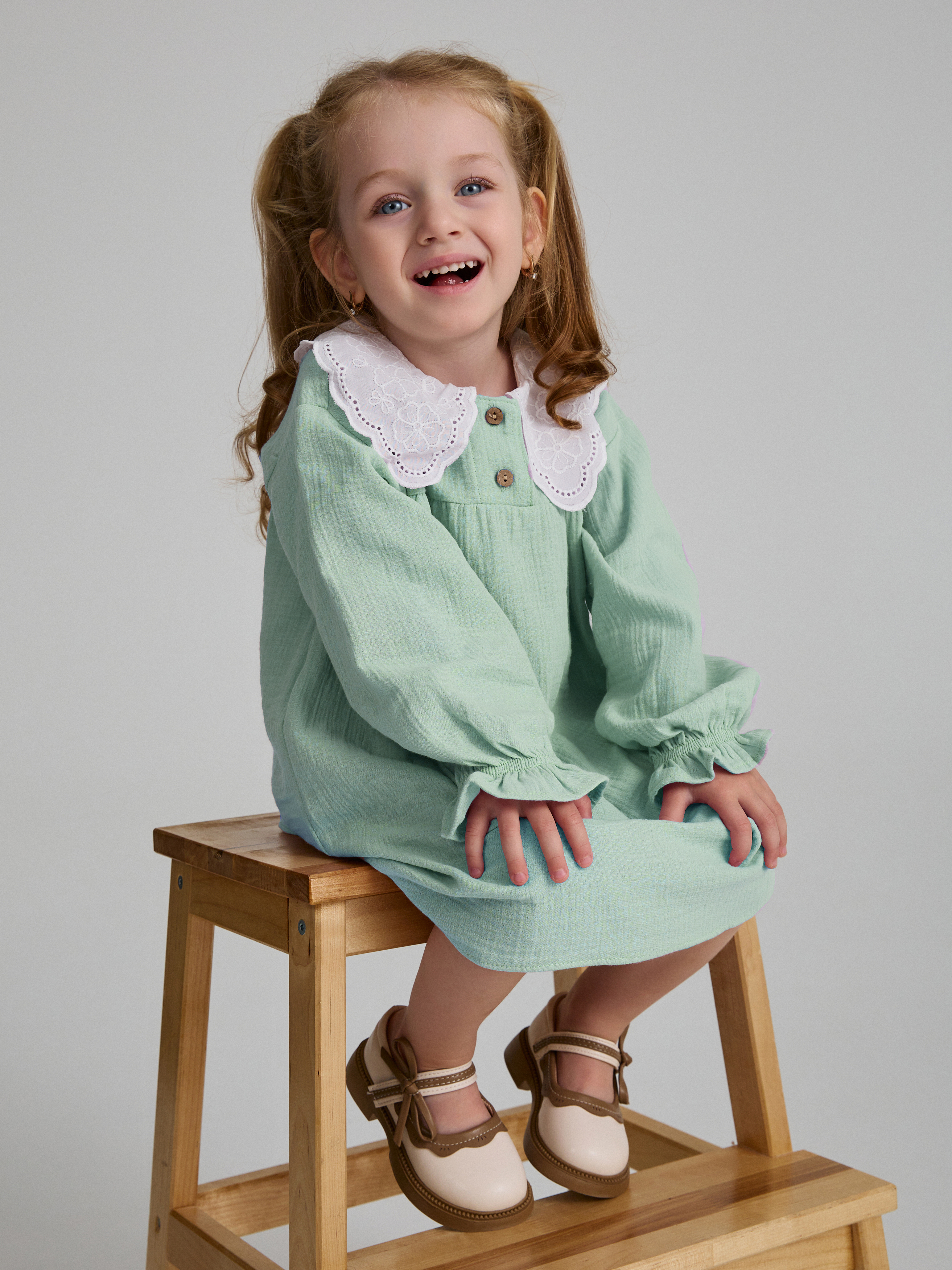 Платье в садик нарядное выполнено из высококачественного хлопка, что обеспечивает невероятный комфорт в течение всего дня. Хлопковая ткань мягкая и приятная на ощупь, она позволяет коже дышать, предотвращая перегрев и создавая ощущение лёгкости. Натуральный материал также обладает гипоаллергенными свойствами, оно легко стирается и сохраняет свою форму и цвет даже после многочисленных стирок. Особенностью этого муслинового платья является его воротник, который придаёт изделию нарядный и праздничный вид.