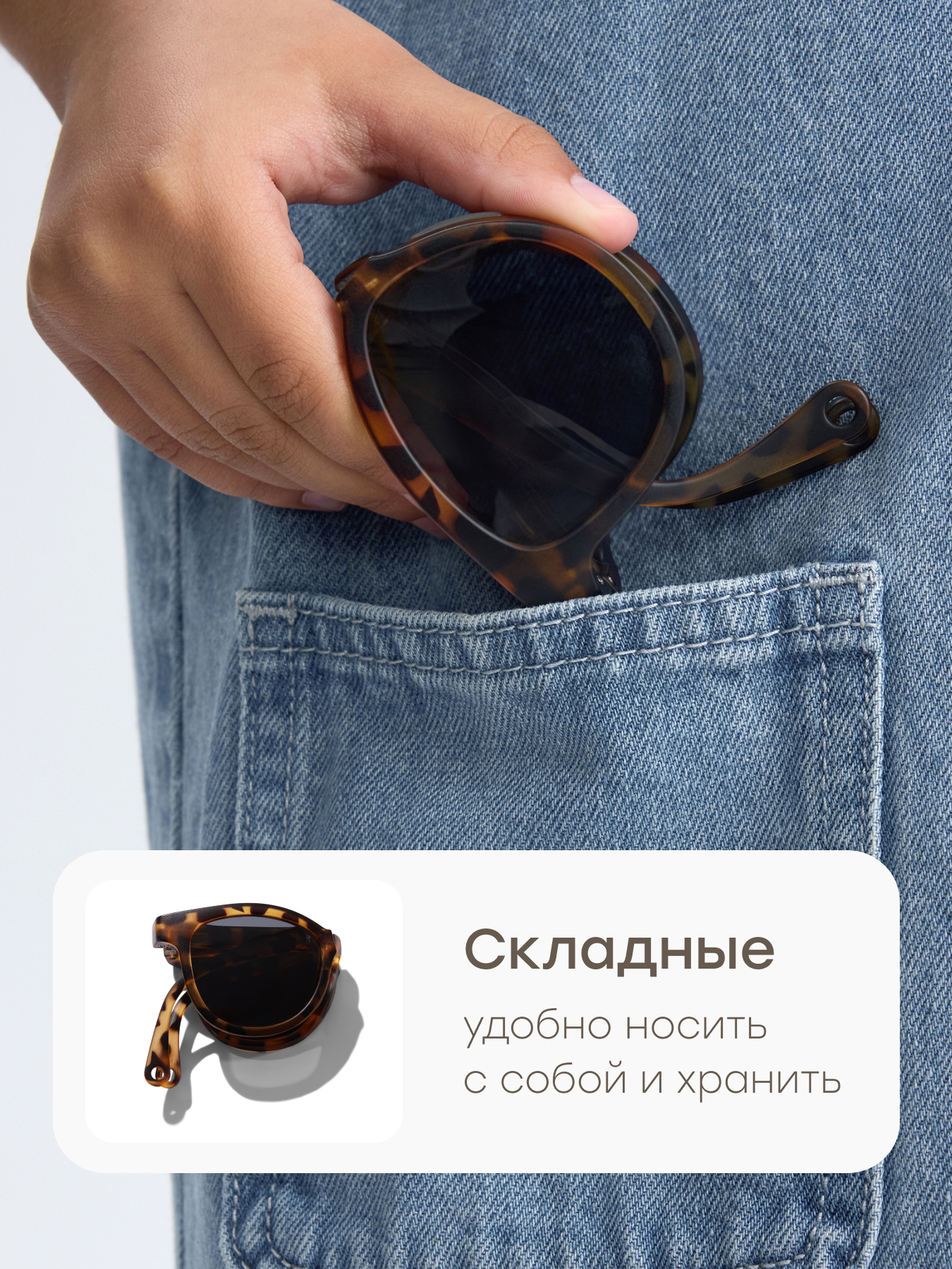 Линзы изготовлены из прочного материала TAC, устойчивого к механическим повреждениям, что гарантирует безопасность использования. Дополнительным преимуществом является складной механизм, благодаря которому солнцезащитные очки для девочки можно компактно убрать в специальный чехол или даже положить в карман.