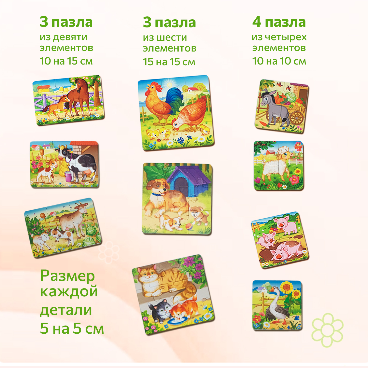 Картонные макси пазлы для малышей На ферме В наборе пазлов 10 бэйби пазлов с изображением домашних животных: 4 пазла 10 на 10 см - 4 элемента, 3 пазла 15 на 10 см - 6 элементов, 3 пазла 15 на 15 см - 9 элементов. Крупные пазлы для детей от года большие, с крупными замочками. Развивающая игра сделана из плотного картона. Большие пазлы для детей 3 лет подходят для мальчиков и девочек. Детские пазлы крупные необходимы для развития памяти и внимания. Составляя между собой логические пазлы большие, ребенок учится соотносить размер животного и различать больших и маленьких животных. Развивающая игра также тренирует мелкую моторику и способствует расширению словарного запаса. Развивающая игрушка выполнена из пазлов для детей и коробки для хранения. Крупные пазлы для самых маленьких идеально подойдут для подарка, такая развивашка порадует кроху.
