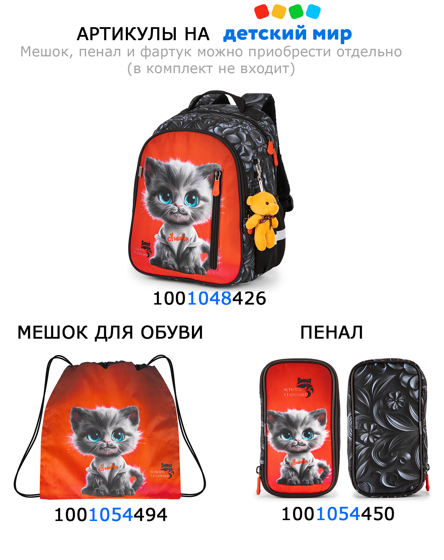 Также можно составить комплект из рюкзака, мешка для сменной обуви и пенала, Вы можете приобрести по следующим артикулам: мешок для сменной обуви 1001054494 рюкзак артикул 1001048426