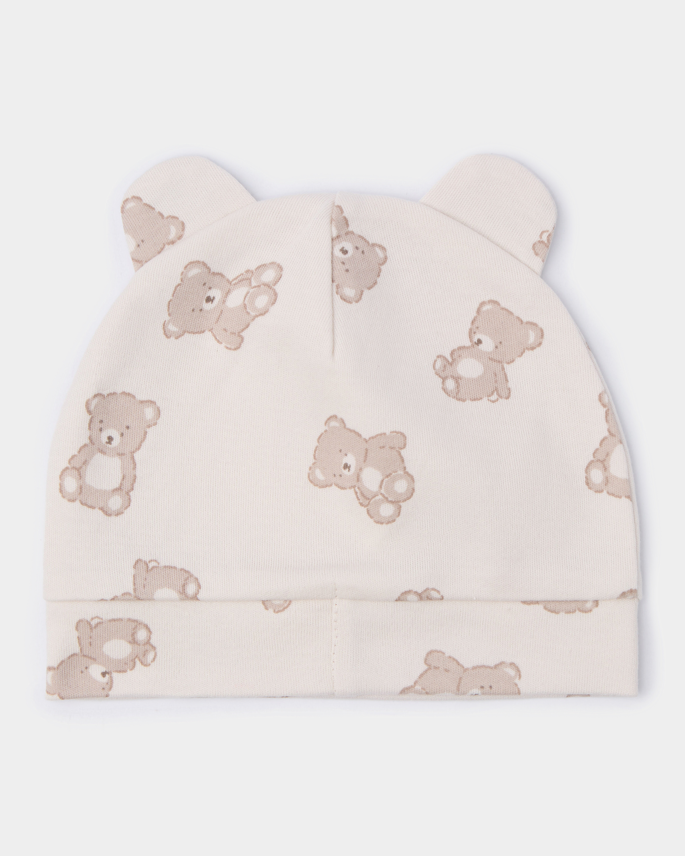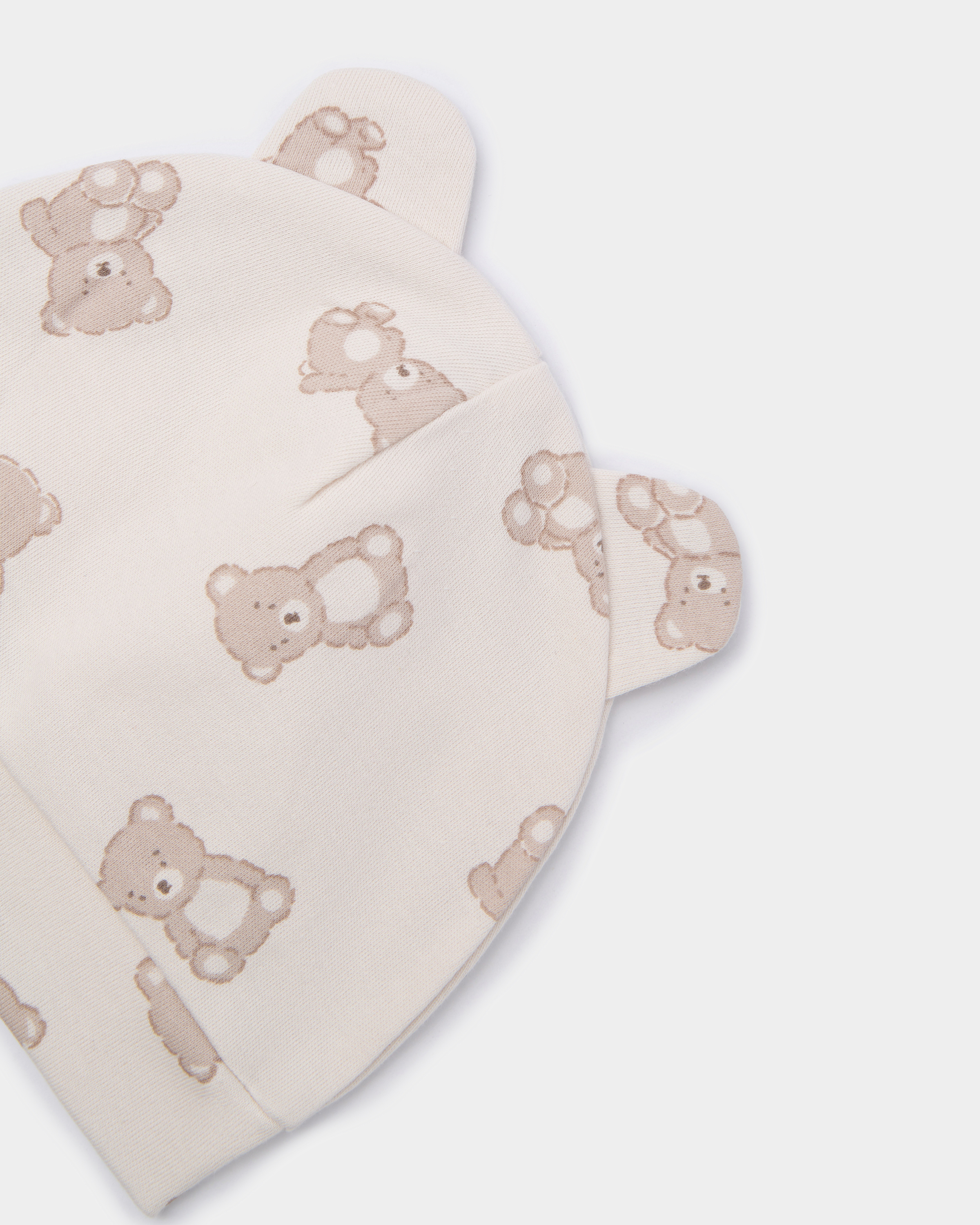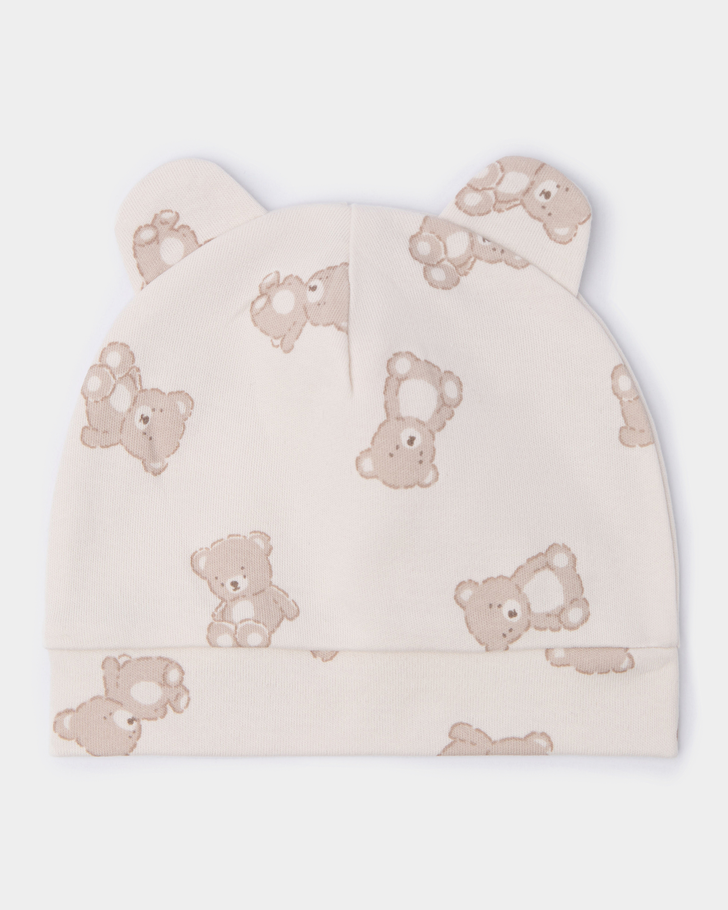 Светло-бежевая шапочка Моя Горошинка с принтом "медвежата" и ушками.
