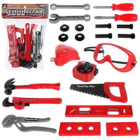 В наборе очки, молоток, уровень, пила, клещи, 2 отвертки, 2 ключа, ключ Стиллсона, респиратор, рулетка, 2 элемента для скрутки, 4 болта, 4 гайки.