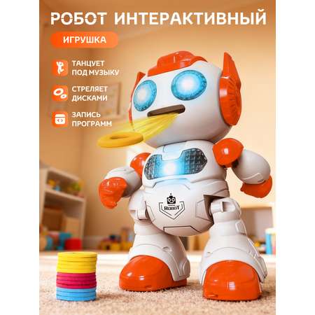 Робот выполнен из качественного пластика, что обеспечивает его долговечность и безопасность для использования. Игрушка имеет оранжевый цвет, который привлекает внимание и делает ее более яркой и интересной.