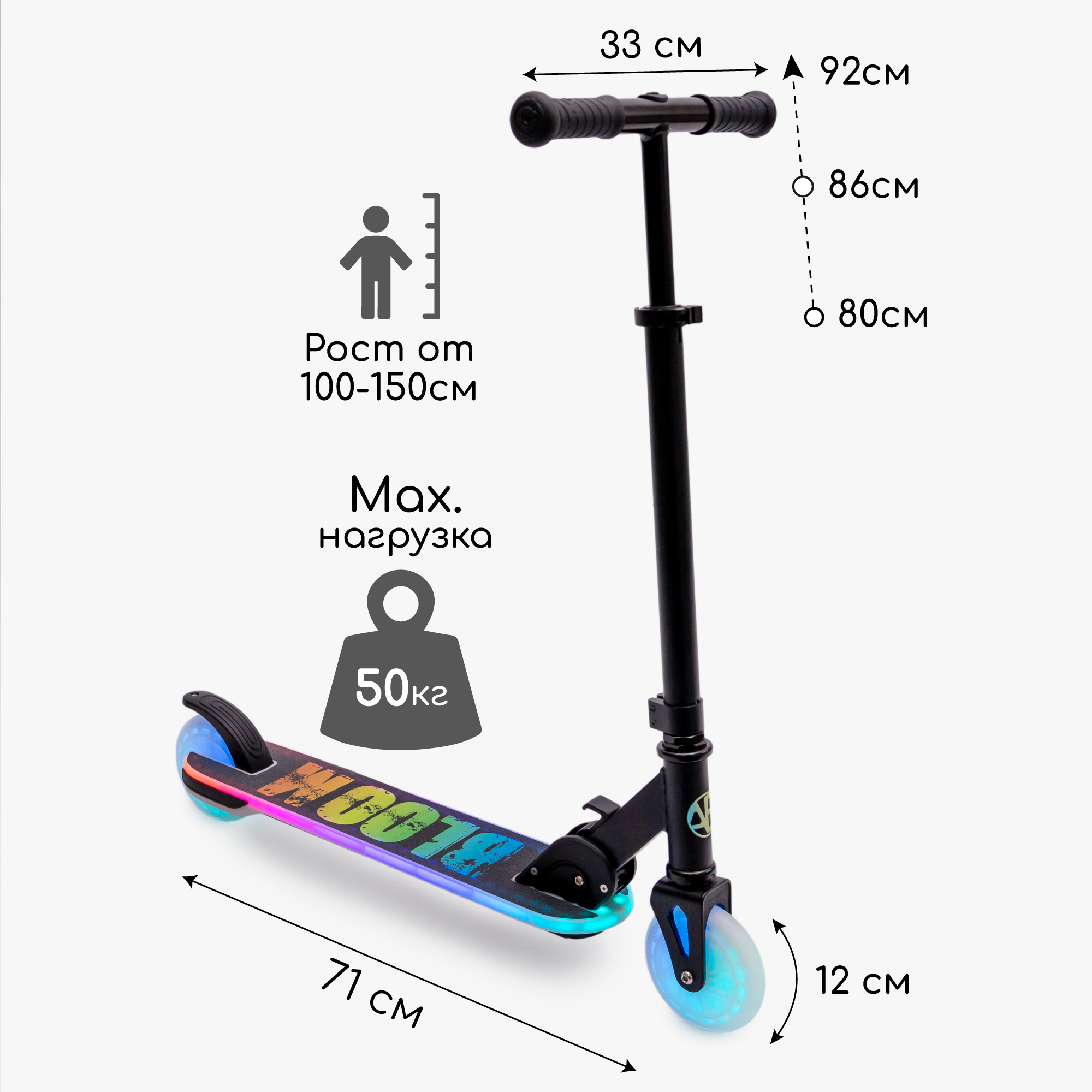 | Конструкция самоката: | с регулировкой руля, складной, со светящимися колесами |