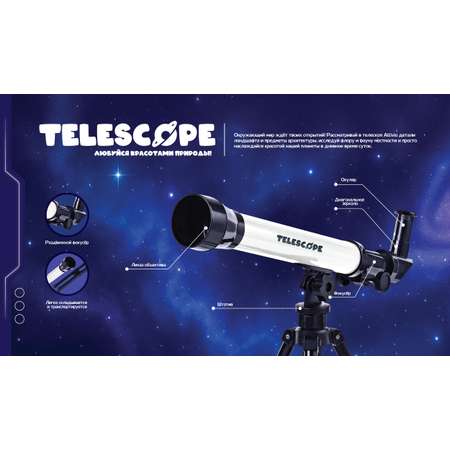 Труба телескопа устанавливается на штатив высотой 30 см. Поворотная монтировка штатива регулируется по высоте от 33 см до 50 см и обеспечивает плавное движение телескопа по вертикали и горизонтали. Телескоп легко складывается и транспортируется. Из простой инструкции юный астроном узнает не только о правилах эксплуатации, но и научится рассчитывать мощность увеличения телескопа.