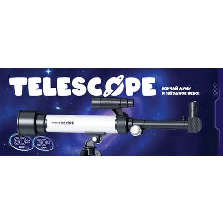 Труба телескопа устанавливается на штатив высотой 39 см. Поворотная монтировка штатива обеспечивает плавное движение телескопа по вертикали и горизонтали. Телескоп легко складывается и транспортируется — это удобно и для ребёнка, и для любителей частых выездов на природу для наблюдений. Из красочной инструкции юный астроном узнает интересные факты о типах телескопов и их создателях, а также научится рассчитывать мощность увеличения телескопа.