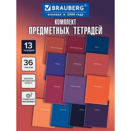 "Тетради BRAUBERG из серии ""КОЛОР"" — это идеальный набор для школьников 5-11 классов. В комплект входят 13 предметных тетрадей формата А5 с 36 листами, что позволяет эффективно организовать учебный процесс. Каждая тетрадь, будь то тетрадь в клетку или линейку, оформлена с учетом всех требований и содержит справочные материалы по основным школьным предметам, таким как Алгебра, Биология, Физика и другие.