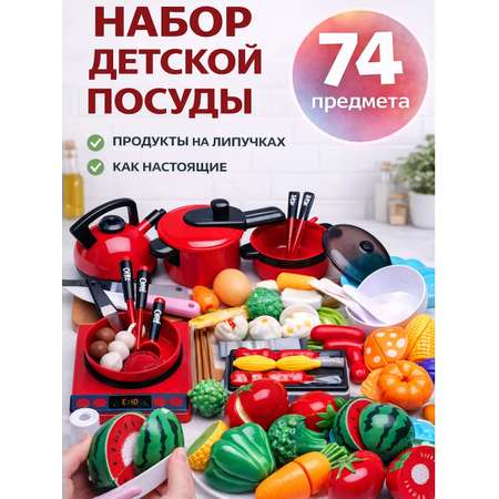 Это детская посуда с игрушечной плитой, чайником и игровые овощи и фрукты на липучках с ножом, которые можно разрезать на половинки и приготовить на гриле или в игрушечной посуде. Также детский набор овощей и фруктов включает в себя игрушечные продукты, которые не нужно резать. Это позволяет ребенку познакомиться с различными видами игрушечной еды.