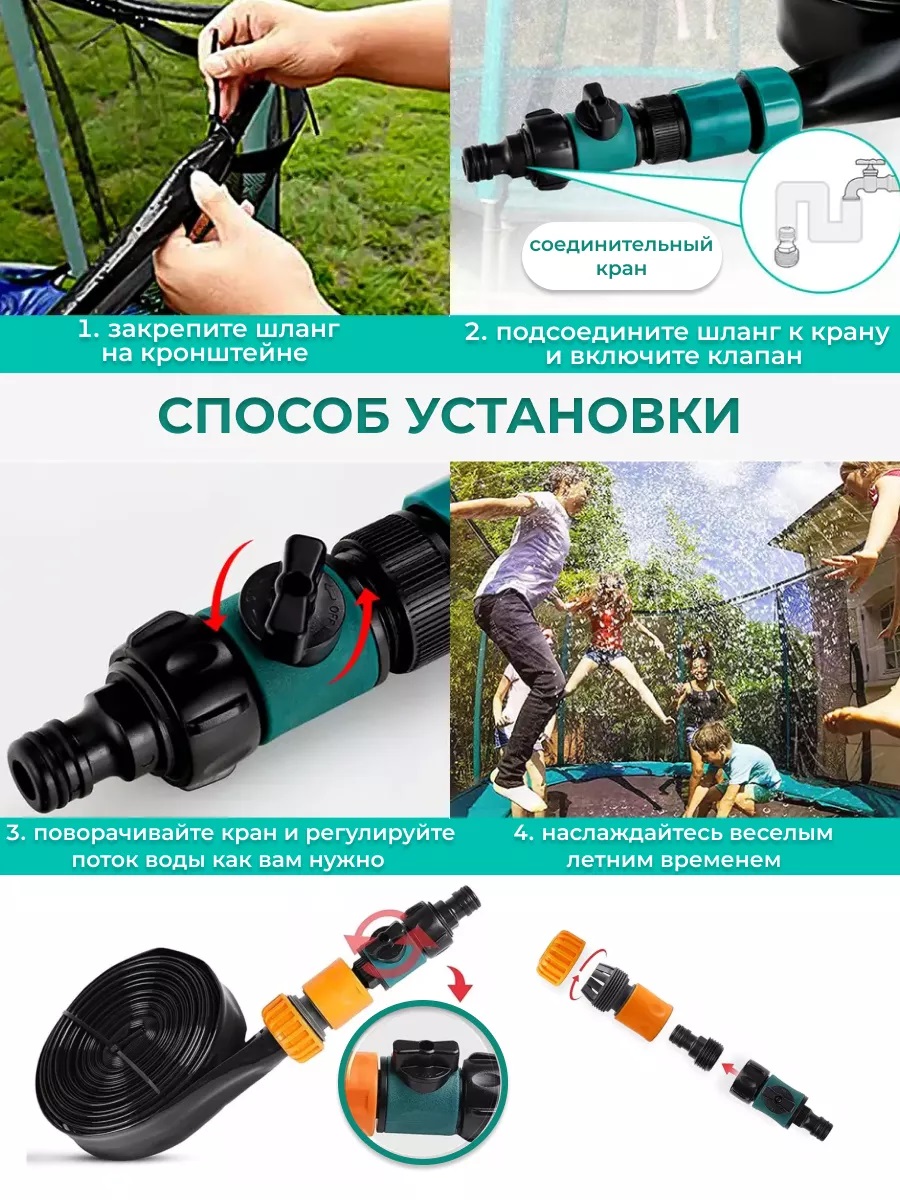 Что делает его таким удивительным? Распылитель подключается к крану или садовому шлангу, что обеспечивает простоту использования и комфорт. Шланг с дырочками обеспечивает равномерное и нежное распределение освежающей воды по всей поверхности батута. Теперь вы можете превращать каждый прыжок на батуте в маленький праздник!