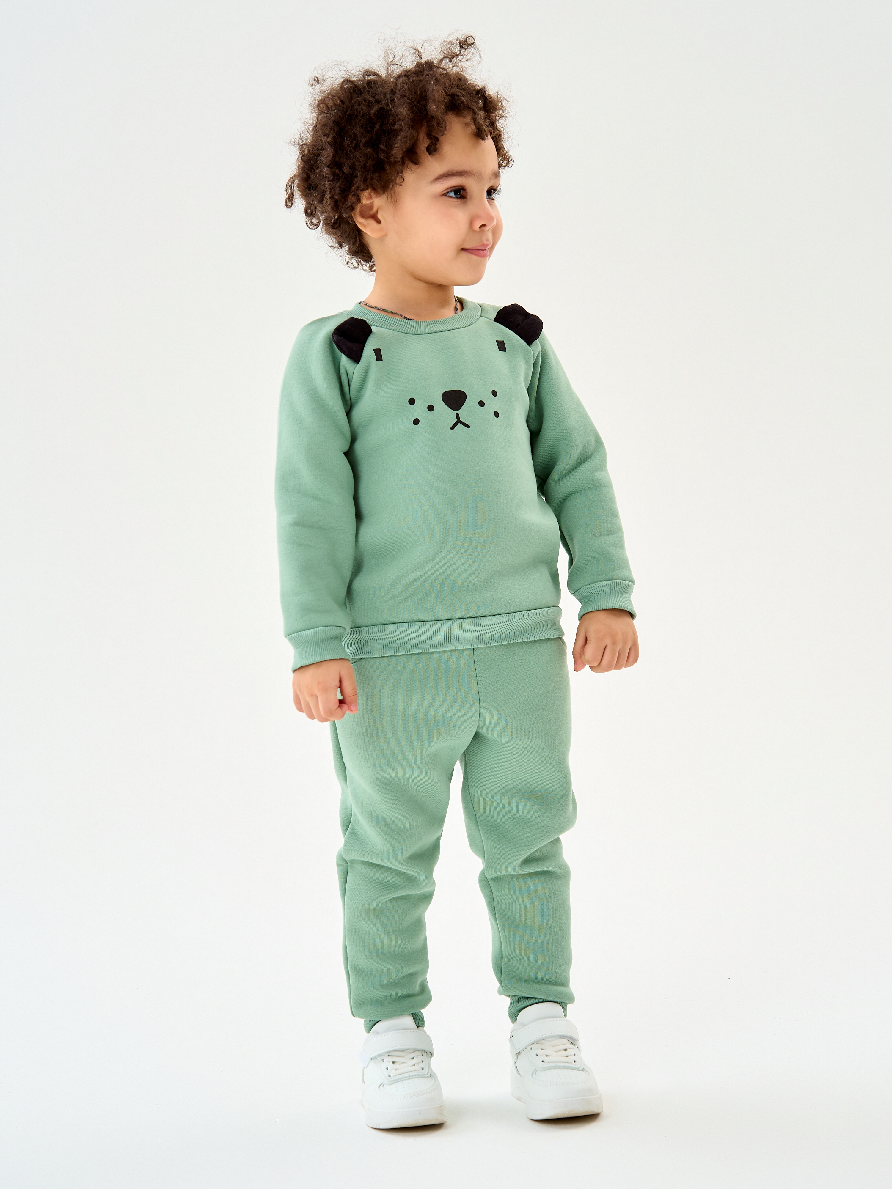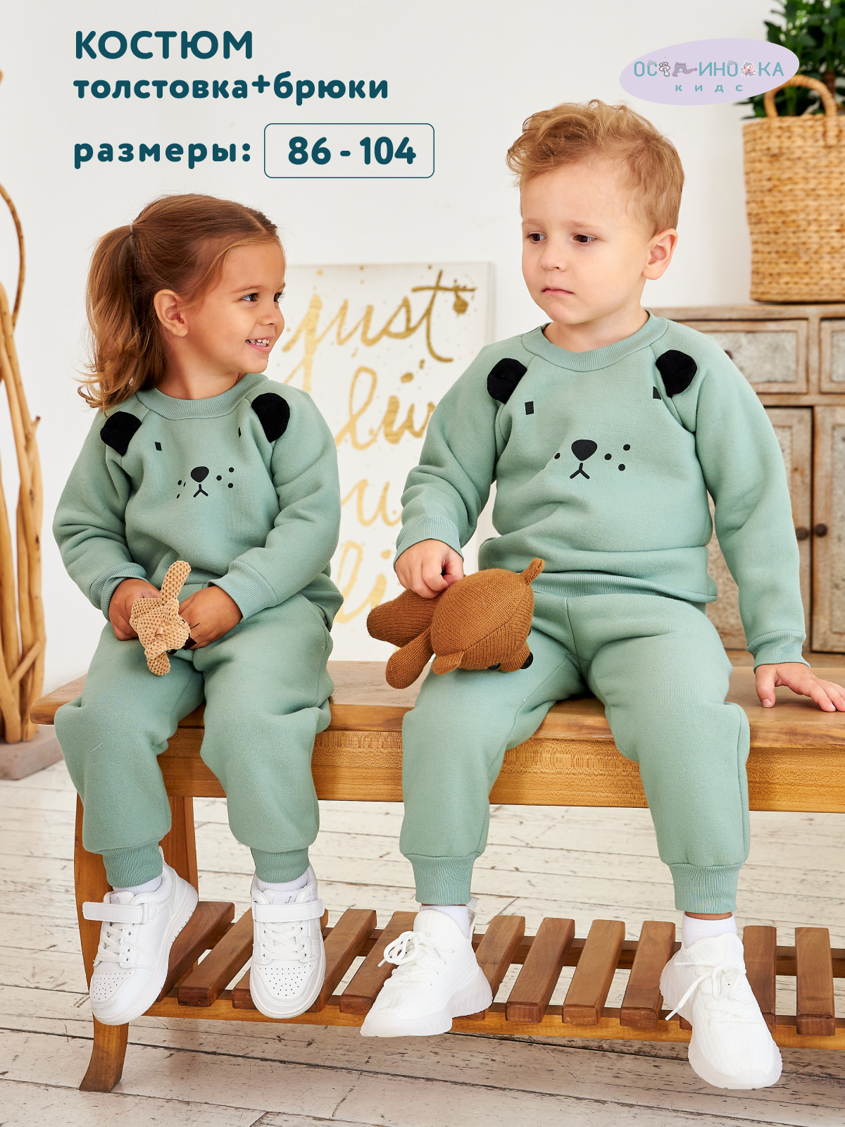 Костюм детский теплый с начесом. Комплект состоит из брюк и худи. Джоггеры с карманами, с поясом на резинке, на манжетах из кашкорсе. Толстовка без капюшона, манжеты и горловина отделаны кашкорсе. Материал, из которого изготовлен костюм, футер 3х нитка с начесом, очень качественный и теплый, подарит уют вашему ребенку в любую непогоду, при занятии спортом, на прогулке и во время активных игр. На толстовке принт медвежонка, ушки 3D отложные, поднимут настроение ребенку. Расцветки универсальные подойдут мальчику и девочке. Костюм двойка для мальчика и девочки - идеальный вариант в подарок на день рождения, на новый год и другие праздники. Отличный вариант костюма в детский сад и на фотосессию. Принт выполнен красками на водной основе, не трескается, не смывается при стирках.