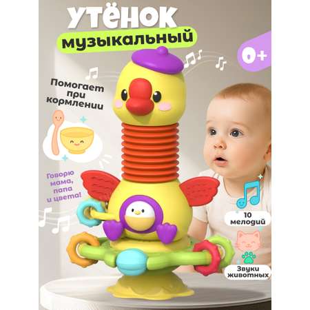 Игрушка крепится с помощью прочной присоски к любой гладкой поверхности — её можно разместить на полу, столике, стуле для кормления или в игровой зоне. Когда малыш взаимодействует с игрушкой, утёнок начинает вращаться, светиться и издавать звуки , что вызывает у ребёнка восторг и побуждает к активной игре.