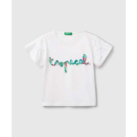 Футболка с аппликацией цветным шнурком и летящими рукавами. В основе коллекций United Colors of Benetton для детей лежат комфорт, стиль и универсальность. Все модели производятся в концепции Dress Safely* (*Одевайся безопасно), которая отвечает за соответствие продукции высочайшим международным стандартам.