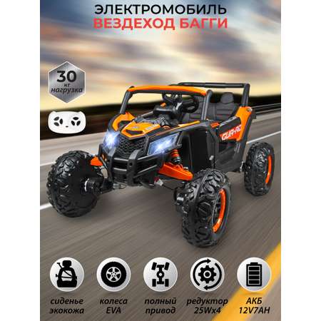 Электромобиль на радиоуправлении с аккумулятором 12V7AH. 4 мотора на колеса 25W, максимальная нагрузка 30 кг, большие размеры машины 104х73х61 см, максимальная скорость 3-8 км в час.