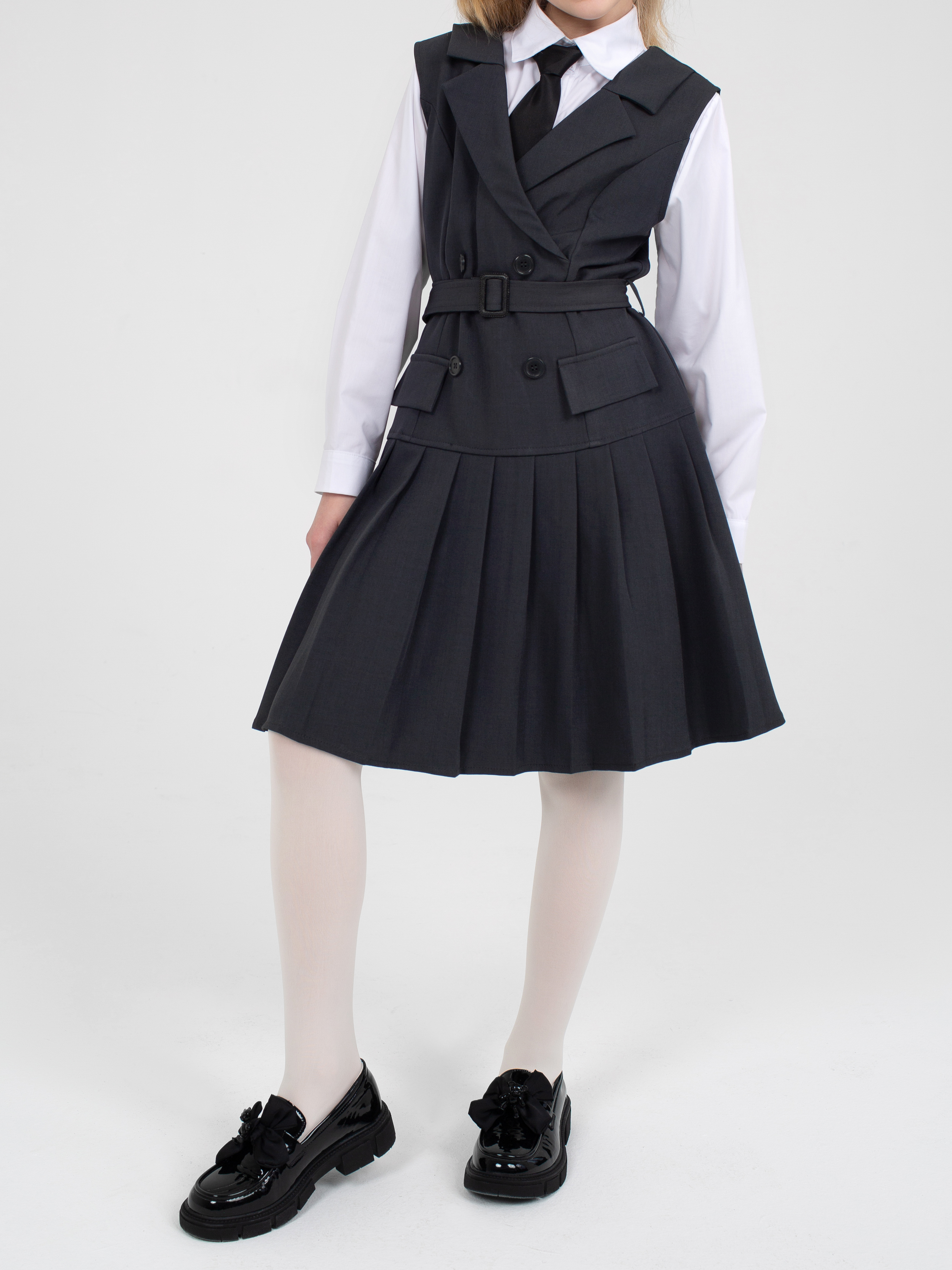 Модель выполнена из костюмной ткани. Детали: - V-образный вырез; - на спине застежка на молнию; - отложной воротник; - юбка в складку.
