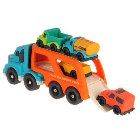 У тягача прорезиненные боковые зеркала. Тягач и маленькие машинки катаются вперёд и назад Весь игрушечный транспорт изготовлен из толстого пластика. 5 предметов.