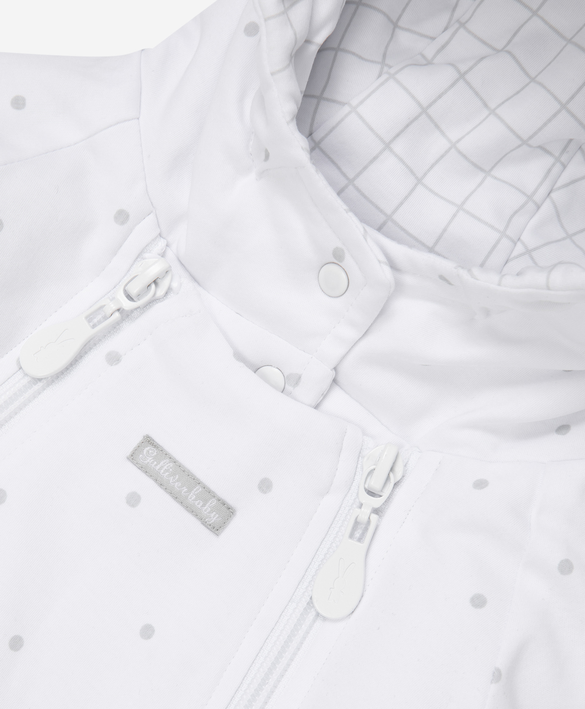 Утеплённый трикотажный комбинезон с ушками — прекрасный вариант для прохладного межсезонья. Он выполнен из мягкого интерлока с деликатным рисунком, приятного по тактильным ощущениям, на однотонной трикотажной подкладке. Специальные манжеты позволяют защитить ладошки малышей от переохлаждения. Две параллельные застежки-молнии облегчают процесс переодевания и сборов на прогулку. В оформлении изделия используется небольшая жаккардовая нашивка.