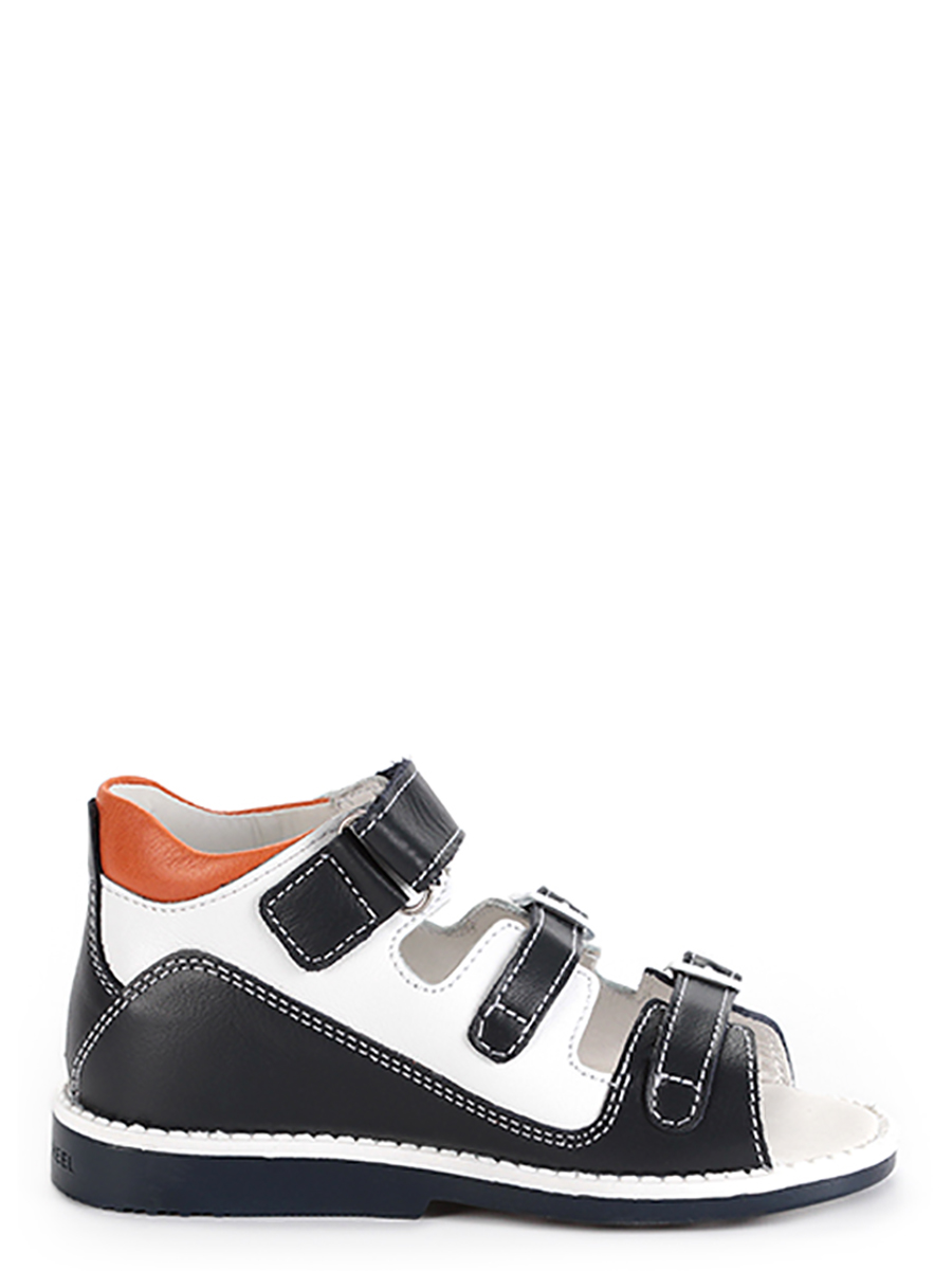 Темно-синие сандалии для мальчиков с яркими оранжевыми и белыми акцентами– идеальный выбор для весны и лета. Выполненные из натуральной кожи, они обеспечат ножкам идеальный воздухообмен, предотвращая потение и дискомфорт даже в самые жаркие дни. Практичная липучка позволяет легко регулировать плотность посадки и дает возможность ребенку самостоятельно справляться с обувью. Закрытая пятка надежно фиксирует стопу, а открытый мысок обеспечивает комфортную вентиляцию. Небольшой каблучок способствует правильному формированию осанки и походки, делая каждый шаг уверенным. Идеальный вариант для активных игр, походов в гости и повседневной носки! Сандалии прекрасно сочетаются с шортами, джинсами и летними костюмами.