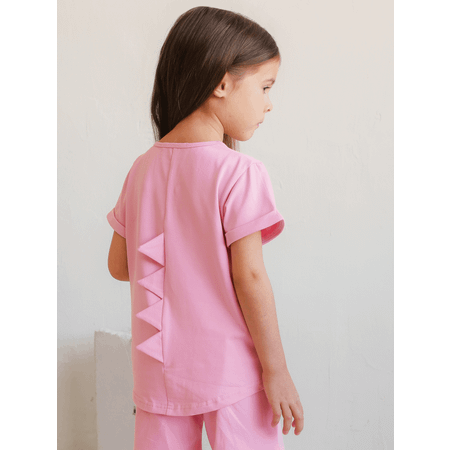 Футболочка с круглым воротом и отворотами на рукавах изготовлена из мягкого и дышащего хлопка, что обеспечивает максимальный комфорт в любой ситуации. Гребни динозавра на спинке — это не только оригинальный акцент, но и элемент, который придаёт изделию уникальность. Они прекрасно держат форму и совершенно не мешают ребенку свободно бегать и играть.