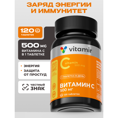 Цена на Витамин Ц для поддержания иммунитета VITAMIR Витамин С 500 мг., 120 шт. - 899 ₽.