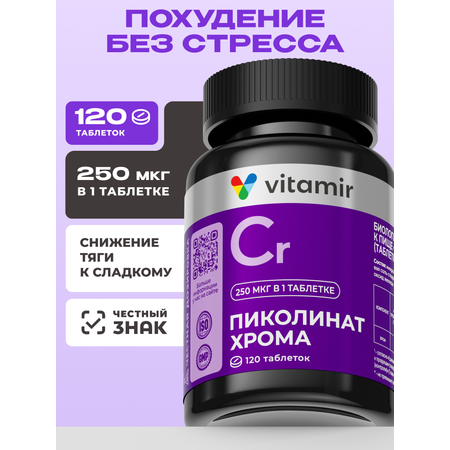 Пиколинат хрома (Chromium Picolinate) VITAMIR БАД для похудения и контроля аппетита, для снижения веса, 120 таблеток