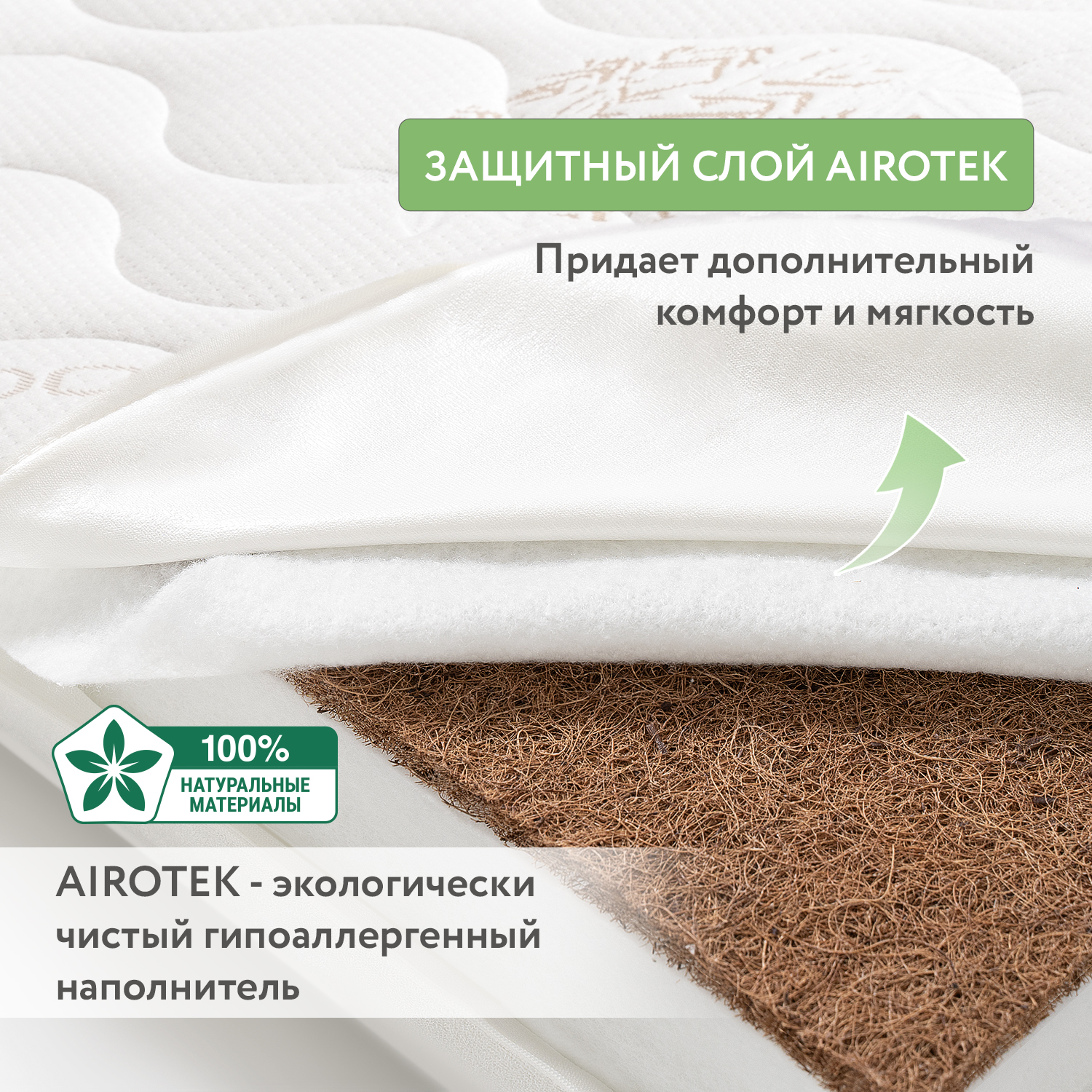 Беспружинный ортопедический матрас имеет две стороны разной жесткости. Сторона с кокосовой койрой обеспечивает жесткую поддержку позвоночника с самого рождения, вторая сторона - для комфортного сна ребенка от 6-ти месяцев.