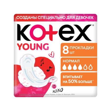 Обновленные женские гигиенические прокладки Кotex Young Normal – наша лучшая защита и комфорт для девочек! Благодаря уникальному верхнему слою и дополнительному абсорбирующему компоненту, прокладка впитывает быстро и на 50% больше, обеспечивая ощущение сухости и усиленной защиты.