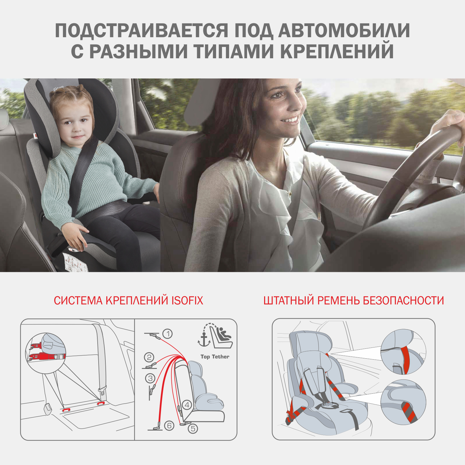 | Крепление: | система Isofix, штатный ремень авто, якорный ремень |