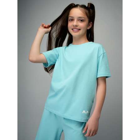 Трикотажный костюм с брюками для девочек и девочек-подростков выполнен из хлопковой ткани кулирная гладь. В комплект голубого цвета входят футболка свободного кроя и брюки палаццо.