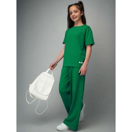 Трикотажный костюм с брюками для девочек и девочек-подростков выполнен из хлопковой ткани кулирная гладь. В комплект зеленого цвета входят футболка свободного кроя и брюки палаццо.