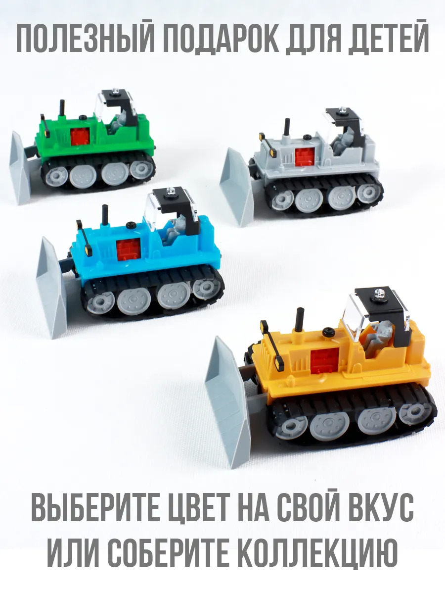 Миниатюрный игрушечный Бульдозер для самых веселых сюжетно-ролевых игр. Трактор непременно понравится всем маленьким любителям игр с машинками. С его помощью малыши могут играть в стройку или в уборку снега. Отлично детализированный и яркий автомобиль поможет сделать игру интересной и разнообразной. У экскаватора подъемный ковш. Чтобы его поднять, достаточно нажать на выхлопную трубу сверху корпуса. Таким образом, ребенок может сдвигать отвалом песок или камни в песочнице. Внутри кабины сидит человечек водитель. Колеса у грейдера пластиковые, а гусеницы прорезиненные. Благодаря этому играть с тачкой можно на любом полу или поверхности, не боясь поцарапать ее. Машинка представлена в 4 цветах. Можно выбрать цвет на свой вкус или собрать коллекцию. Игры с маленьким трактором развивают у ребенка мелкую моторику, фантазию, воображение и навыки социального общения. Расширяют представления об окружающем мире. Мини бульдозер изготовлен из безопасного ударопрочного пластика. Его размеры 7,5 х 7,5 х 12 см. Функциональная механическая игрушка из СССР без проводов и дистанционного управления приводится в движение с помощью рук. Игрушечный набор со строительной техникой прикольный и полезный подарок мальчикам и девочкам от 3 лет на Новый год, День рождения, 8 марта, 23 февраля, 1 сентября, выпускной в садике и просто так без повода. У вашего крестника или племянника скоро праздник, а вы еще не определились с подарком? Обратите внимание на наш подарочный набор - он обязательно понравится дошкольникам. Купите детскую игрушку для умных игр и общего развития малыша. Игрушка из пластика не способна вызвать аллергию или раздражение, поэтому подходит для детей разного возраста. Играйте с удовольствием!