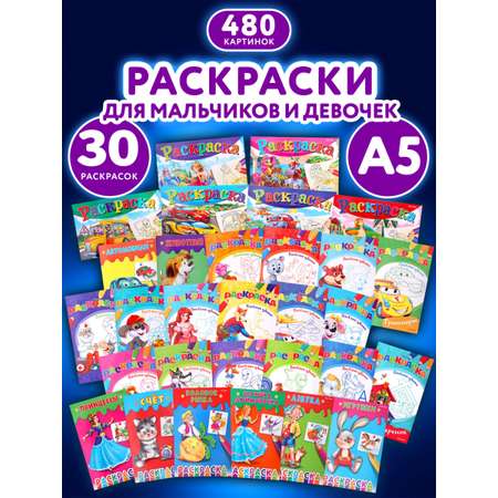 Раскраски детские Prof-Press набор Для девочек и мальчиков А5 30 штук