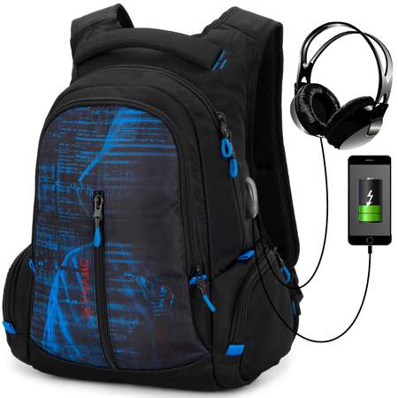 Рюкзак школьный для мальчика 19 л с твердой анатомической вентилируемой спинкой SkyName (СкайНейм), подходит для подростков и учеников средних и старших классов. Такой рюкзак молодежный с вместительными отделениями и удобными лямками понравится мальчикам и ученикам начальной школы. Здоровое ношение подросткам обеспечивает жесткая вентилируемая спинка анатомической формы с плотными вставками из мягкой дышащей губки и небольшой вес 900 гр. Широкие плотные лямки S-образной формы с грудным креплением-стяжкой (фастекс) и мягкими вставками не соскальзывают при ношении. Нагрузка по спине ребенка распределяется равномерно. Рюкзак подростковый для мальчика из водоотталкивающей ткани имеет два больших отделения для тетрадей А4 или гаджетов с диагональю до 15”. Основной отсек с объемным карманом с уплотнённой вставкой можно использовать для самых больших учебников или ноутбука до 15”. Спереди расположен карман-органайзер для разных мелочей и канцтоваров. Два боковых кармана и спереди небольшой карман на молнии. Мужчины оценят вместительное отделение с переходником для USB и проводом с внутренней стороны для зарядного устройства и разъемом для наушников. Просто подключите с одной стороны пауэрбанк, а с другой- телефон. Укрепленная ручка с удобным захватом, петля для переноски и регулируемые лямки позволят школьнику с комфортом носить свой ранец между уроками. Ножки на дне школьного портфеля для мальчиков обеспечивают устойчивость. Дополнительными строчками прошиты все места с основными нагрузками. Крепкие молнии от фирмы SBS легко открываются. Бегунки и надежная фурнитура на спортивном рюкзаке не деформируются. Принт черного школьного рюкзака модный и лаконичный. Молния основного отделения открывается в обе стороны. Такой легкий черный городской рюкзак — это правильный выбор для подростков и студентов для учебы и спорта. Маме он пригодится как идея подарка папе на 23 февраля или Новый год.