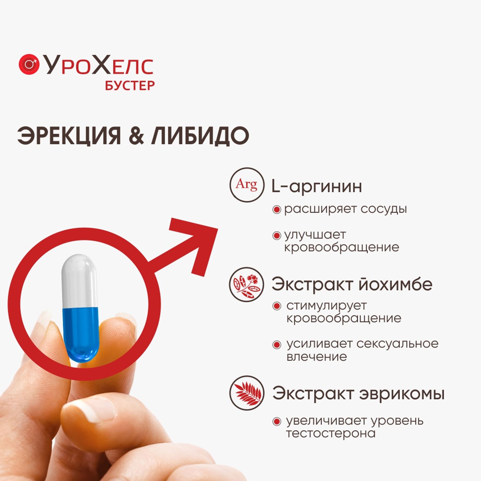 Позаботьтесь о своем мужском здоровье с БАД УРОХЕЛС БУСТЕР! Если вы ищете средство для улучшения потенции и хотите вернуть уверенность в себе, продукт УРОХЕЛС БУСТЕР создан именно для Вас! С формулой, направленной на повышение потенции, вы сможете ощутить естественное увеличение тестостерона, что является ключевым фактором для поддержания вашей силы и энергии. УРОХЕЛС БУСТЕР в капсулах способствует повышению либидо у мужчин, обеспечивает усиление влечения, что делает его отличным натуральным афродизиаком. Сочетание 8 мощных натуральных компонентов обеспечивает комплексный подход к повышению сексуального влечения и улучшению эректильной функции: