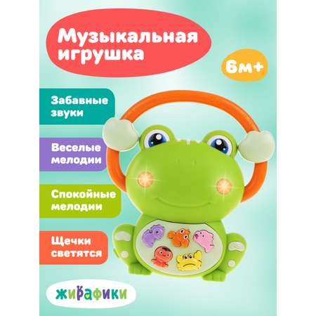 Музыкальная игрушка «Лягушонок» ТМ «Жирафики» обязательно понравится малышу. Нажимайте на кнопочки и слушайте забавные звуки животных, веселые и спокойные мелодии. Переключайте три режима игры с помощью кнопки со стрелочкой. Наблюдайте вместе с малышом за тем, как щечки лягушонка светятся. А еще у лягушонка есть ручка – малышу будет удобно держать игрушку в руках. Уровень громкости можно регулировать. Игрушка работает от 3-х батареек типа AAA на 1,5 V (не входят в комплект). Размер игрушки (ДxШxВ): 12,8x5,5x13,5 см. Изготовлено из полимерных материалов. Рекомендованный возраст: 12 месяцев+Цены в интернет-магазине могут отличаться от розничных магазинов.