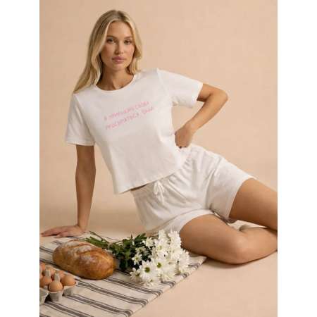 Пижама для женщин Mark Formelle. Женский комплект пижама с шортами в полоску и футболкой от белорусского бренда Mark Formelle. Футболка прямая укороченная и свободная, без воротника, с короткими рукавами и немного спущенной линией плеча. Шорты свободные, с завышенной посадкой и резинкой внутри. Милая демисезонная модная пижамка в костюмном стиле для отдыха, как одежда для дома и сна. Классическая верхняя часть в строгом стиле, закрытая. Низ открытый, игривый, укороченная длина шорт добавляет изюминку всему комплекту. Костюм с шортами подойдет для девушек подростков, а также для взрослых женщин плюс сайз (plus size) больших размеров. Марк Формэль - гарантия качества собственного производства в Беларуси