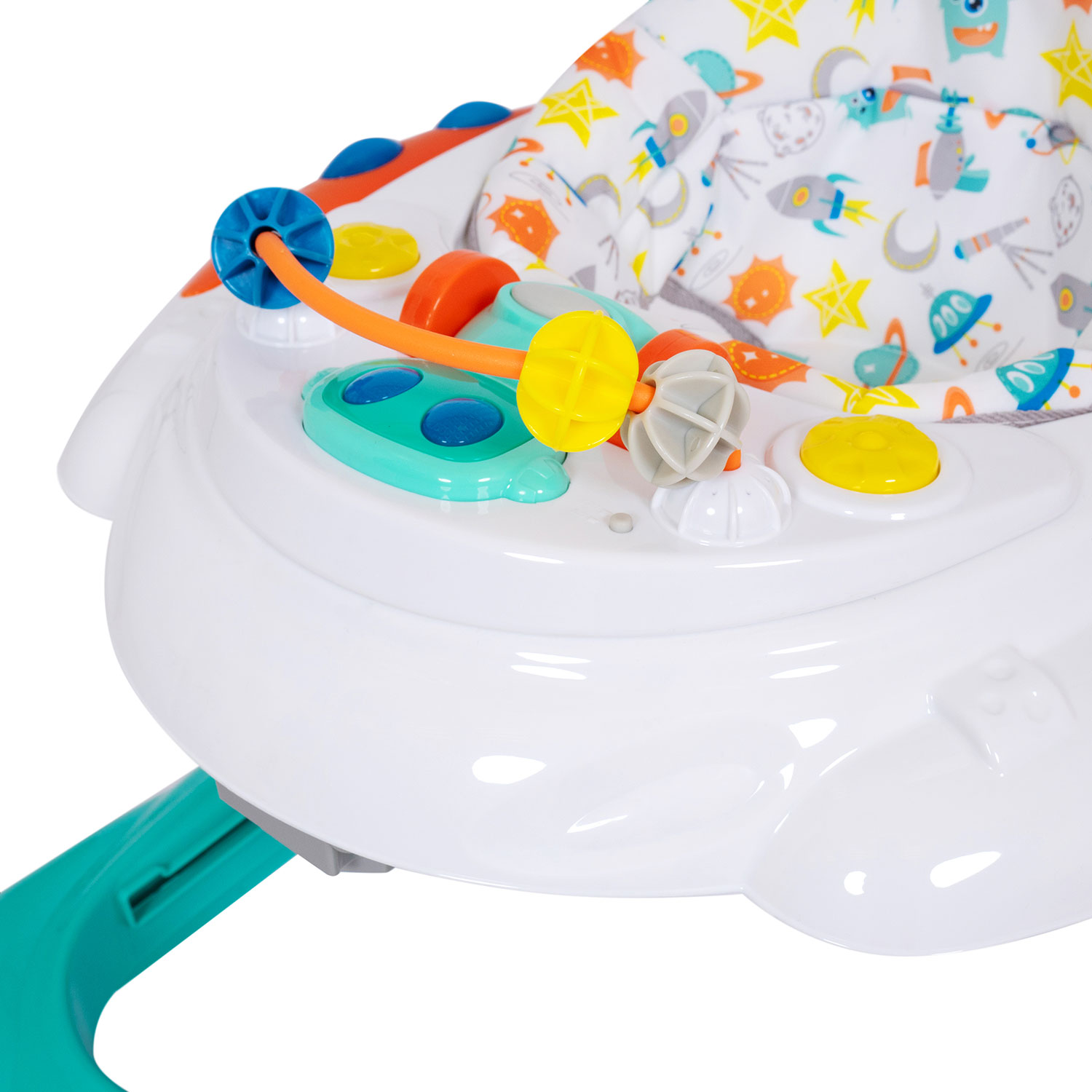 Дизайн ходунков напоминает гоночный космический корабль, имеется даже спойлер, установленный сзади. Это впечатление усиливается миганием световых сигналов на боковых панелях, которые загораются в то время, как малыш начинает двигаться в ходунках. Разнообразные музыкальные кнопки, джойстики, вращающиеся колесики и фигурки, закрепленные на дуге — каждый элемент игровой панели предназначен для разностороннего развития ребенка, тренировки мелкой моторики и внимания.