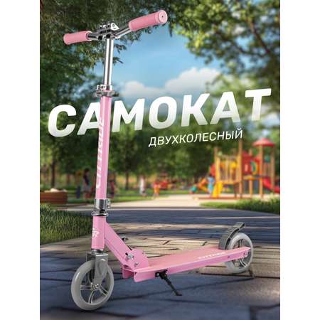 Двухколесный детский самокат комплектуется подножкой, благодаря которой его можно ставить, не опасаясь падения.