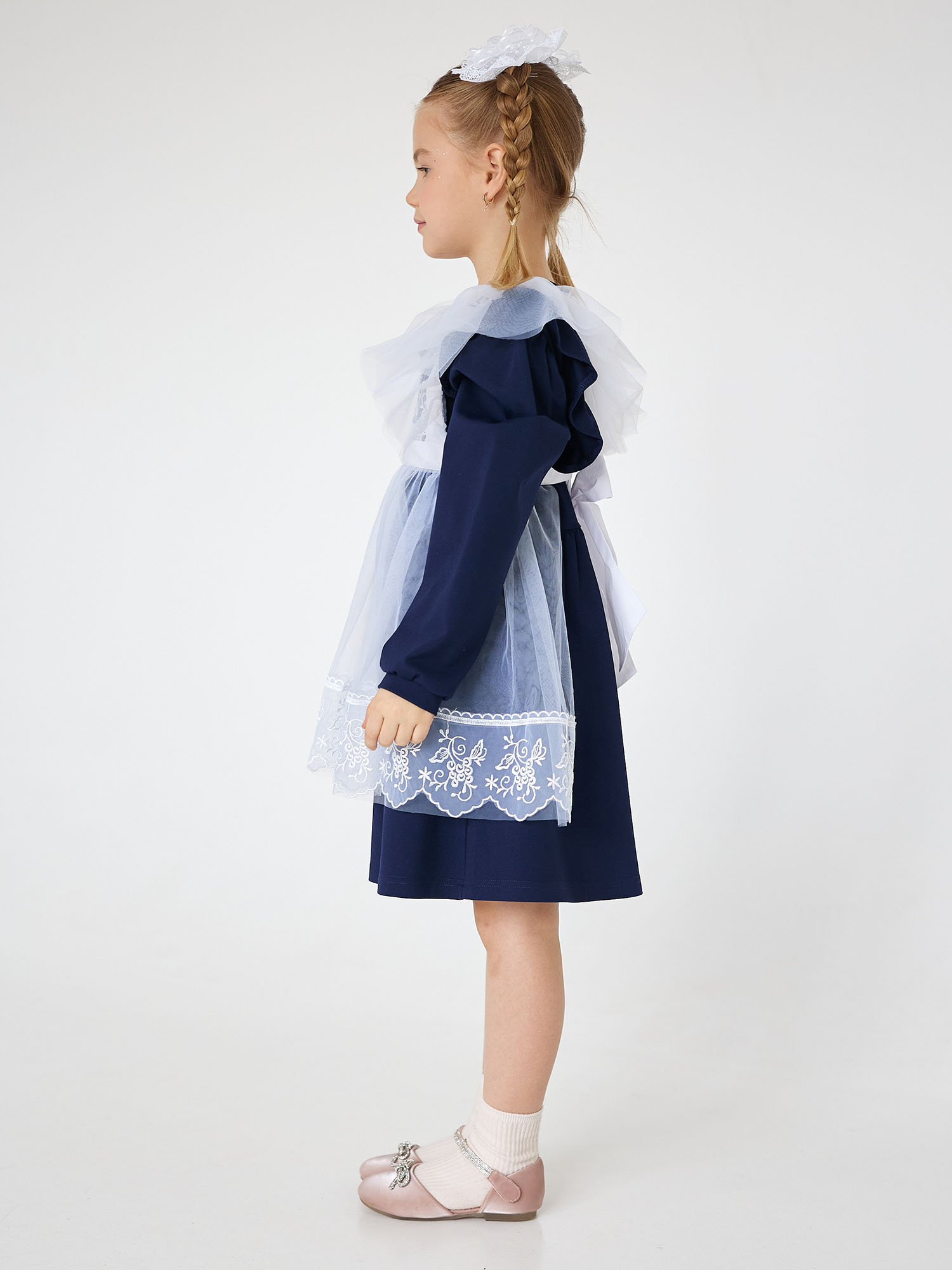 Фартук школьный белый для девочек из тонкой сетки и кружева. Подходит для повседневного ношения в школу, на первое сентября и последний звонок. Бретели можно зафиксировать за спиной в положениии крест-на-крест.