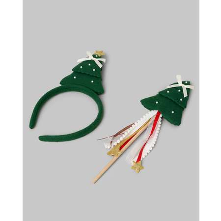 Зелёный ободок с декором в виде ёлочки и мягким основанием. Волшебная палочка из дерева с аналогичным декором - реквизит, дополняющий образ.