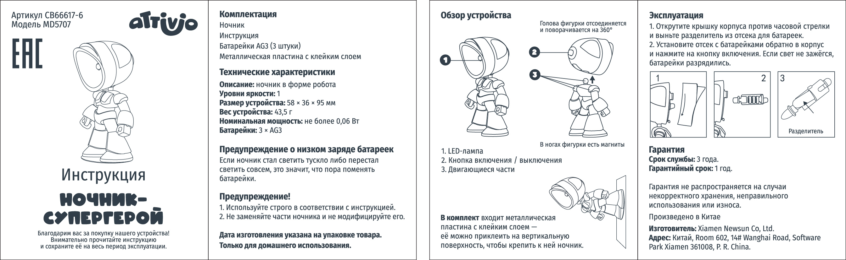 над рабочим местом и закрепить на ней светильник. Направляй свет куда тебе нужно поворотом головы героя. Устройство работает от 3 батареек AG3 (в комплекте).