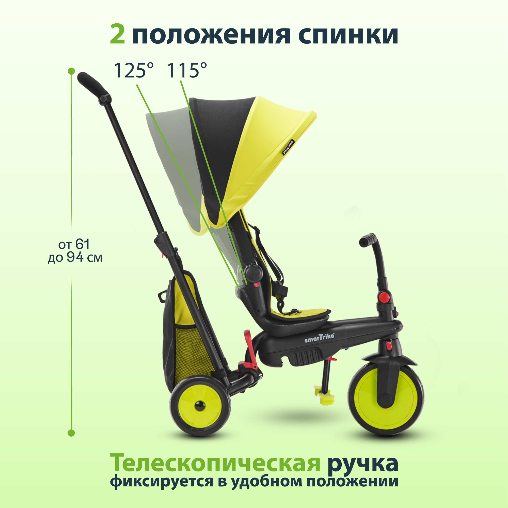 - Телескопическая родительская ручка регулируется на любой удобной высоте от 61 до 94 см.