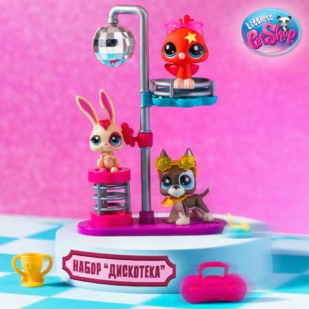 Главные герои набора "Дискотека" — модные и стильные красный павлин, немецкий дог и кролик, которые могут похвастаться новой для серии LPS характеристикой — они умеют качать головами! Танцплощадка с диско-шаром станет главным местом действия, где герои будут показывать свои лучшие танцы. Очки и цепь с кулоном добавят персонажу неповторимый образ. Микрофон даст возможность устраивать концерты, магнитофон обеспечит отличное музыкальное сопровождение, а кубок и миска с коктейлем превратят игру в роскошную вечеринку. Движущиеся элементы площадки позволят воссоздать динамику реальной дискотеки.