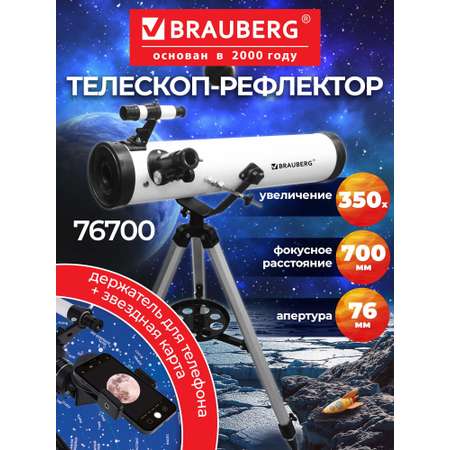 Здравствуйте! Как подсоединить телефон? Ответ представителя брендаДобрый день, Максим! В данном комплекте в подарок идёт держатель для телефона, чтобы было удобнее. Подсоединять телефон к телескопу не надо и это невозможно технически, а для того, чтобы воспользоваться держателем Вам нужно просто поставить его и вставить внутрь телефон. Желаем Вам хорошего дня и настроения! :)Здравствуйте. Как скоро будет в продаже ? Ответ представителя брендаДобрый день! Рекомендуем следить за наличием, нажав кнопку 'Уведомить о появлении' на странице товара. Точная дата поставки на текущий момент не установлена. Хорошего Вам дня и прекрасного настроения! :)Здравствуйте!Что нужно,чтобы днем наблюдать за природой в не перевернутом виде?Что дополнительно приобрести? Ответ представителя брендаПриветствуем Вас, Таисия! Чтобы изображение в рефлекторе не было перевёрнуто, необходима оборачивающая призма, в комплект она не входит. В нашем ассортименте, к сожалению, призма не представлена. Для телескопа Brauberg 76700 можете подобрать оборачивающую призму, учитывая посадочный диаметр окуляров 24.51 мм. Прекрасного Вам настроения и приятных покупок!