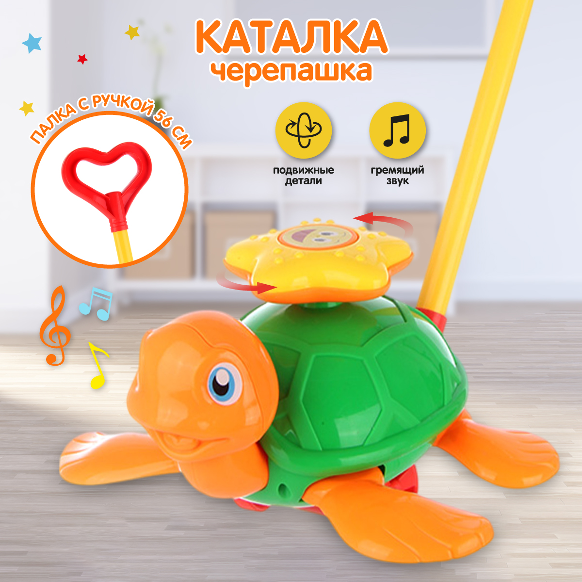 Детская каталка черепаха на палке для развития мелкой моторики и сенсорных навыков малыша. Изготовлена из прочного и долговечного материала. Игрушка каталка оформлена в оригинальном дизайне и классической расцветке. Катается вперёд и назад. У черепашки при движении двигаются лапки, звезда на панцире вращается, издаёт гремящий звук.