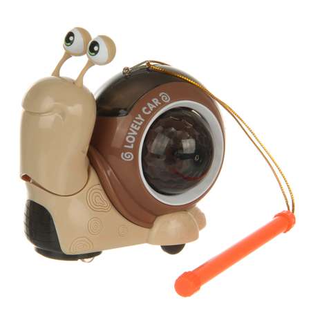 Игрушка на батарейках проигрывает мелодию, передвигается вперед, умеет шевелить головой. У игрушечной улитки есть палочка, можно направлять игрушку.