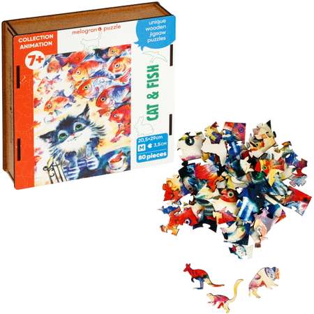 Деревянные пазлы Кот и рыбки от Melograno – это увлекательная игра с красивой картинкой, которая понравится детям. Яркие детали легко соединяются, а собирать их весело и интересно! Пазлы подойдут для ребят от 7 лет, которые любят рисовать, фантазировать и собирать красивые изображения по частям.