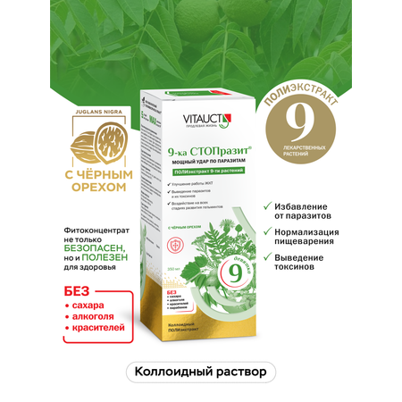 Антипаразитарный комплекс 9-ка СТОПразит от Компании Витаукт - это натуральный ПОЛИэкстракт из 9-ти лекарственных растений, горечи которых пагубно действуют на все виды, формы и стадии паразитов!