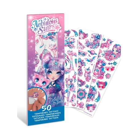 Комплект включает в себя 3 листа, на которых размещены 50 ярких и красочных татуировок, вдохновлённых очаровательной девочкой-звездочкой Небулией и её верным питомцем — мифипэт Стеллой.
