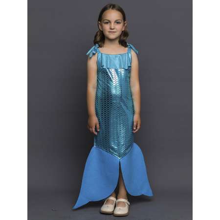 Карнавальный костюм для девочки Русалочка представляет собой нарядное голубое платье на лямках. Платье выполнено из блестящей ткани с рисунком чешуи и заканчивается хвостом из фетра. Яркий сценический образ, в котором любая девочка будет звездой праздника.