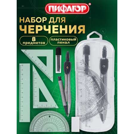 "Готовальня ПИФАГОР 8 предметов — идеальный набор для черчения, который станет незаменимым помощником школьника на уроках геометрии. Этот школьный набор включает металлический циркуль длиной 120 мм с механическим карандашом и несгибаемыми штангами, что обеспечивает точность и долговечность при выполнении чертежных работ. Кроме циркуля, набор оснащён линейкой 12 см, транспортиром 180°, двумя треугольниками (45° и 30°-60°), ластиком и запасными грифелями, аккуратно упакованными в пластиковый пенал с европодвесом. Такая готовальня школьная идеально подходит для учеников разных классов, помогая развивать навыки точного черчения. Этот комплект канцтоваров для школы — всё, что нужно для комфортного и качественного обучения, удобство и функциональность в одном наборе для черчения.